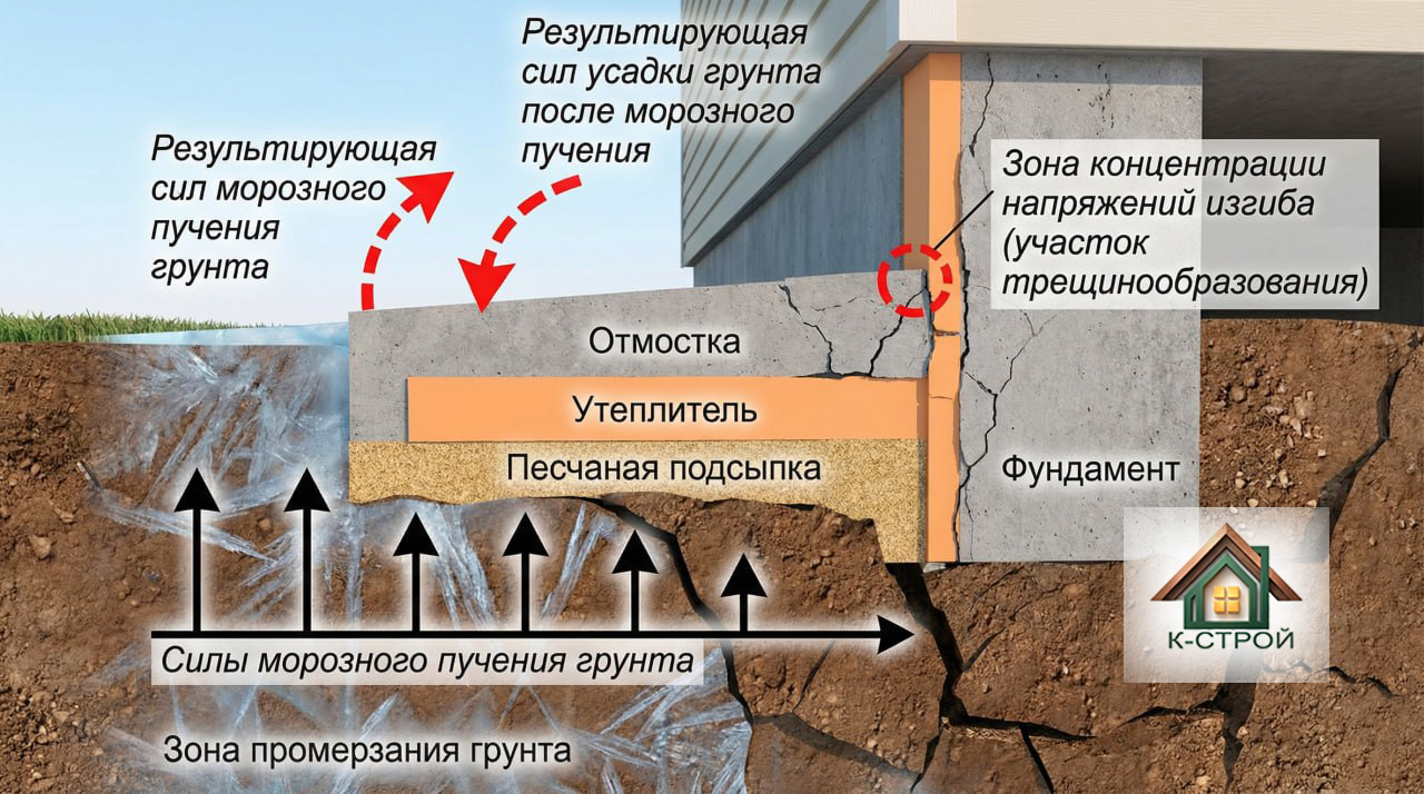 Во-вторых, при замерзании вода расширяется на 9%, создавая огромное давление на фундамент. Это явление называется морозным пучением, и оно способно поднять даже массивное строение. Вспомните, как зимой асфальт на дорогах трескается от льда — тот же принцип, только под вашим домом.